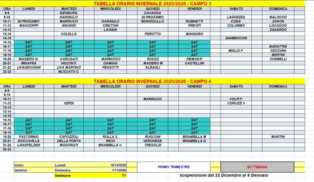 Vi ricordiamo che questi orari valgono dal 13 Ottobre al 11 Gennaio (ad eccezione del periodo dal 22 Dicembre al 4 Gennaio in cui i campi saranno a prenotazione libera).