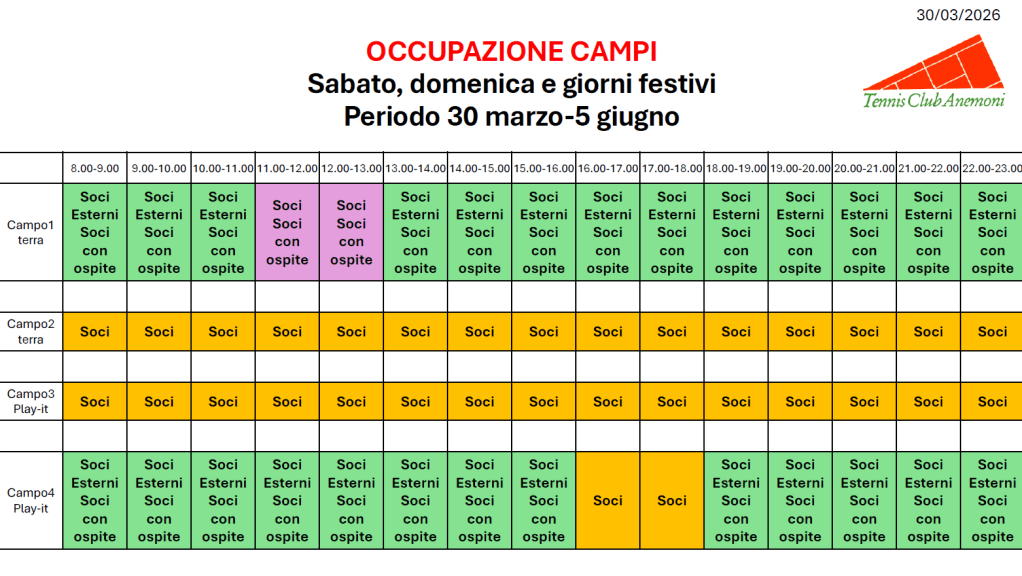 trovate in allegato il tabellone relativo all’ occupazione dei campi per il periodo 30 Marzo- 5 Giugno.